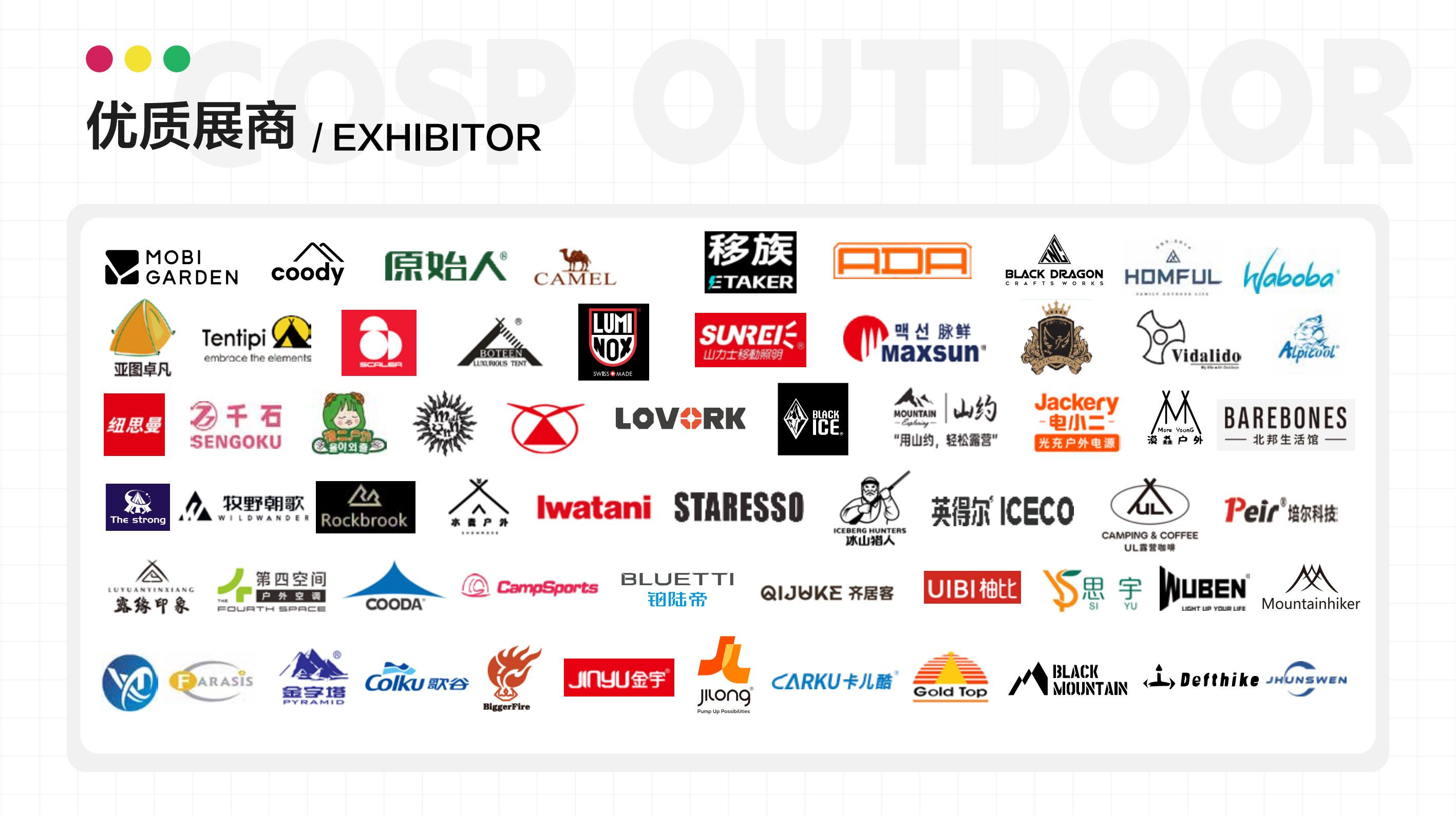 户外露营及附件类展区:长途旅游、户外房车、太阳能背包、登山包、急救包、指南针/定位系统、炊具/燃料、急救用品、应急灯、登山鞋,徒步鞋,高山靴,攀岩鞋,沙滩鞋/凉鞋、户外休闲鞋、户外手电筒、护具、户外水壶、头盔、防潮垫、地席水壶、水具炉具、烧烤炉、通讯/导航、户外刀具、户外表、射击、望远镜、登山杖、手杖毛巾、户外移动电源等