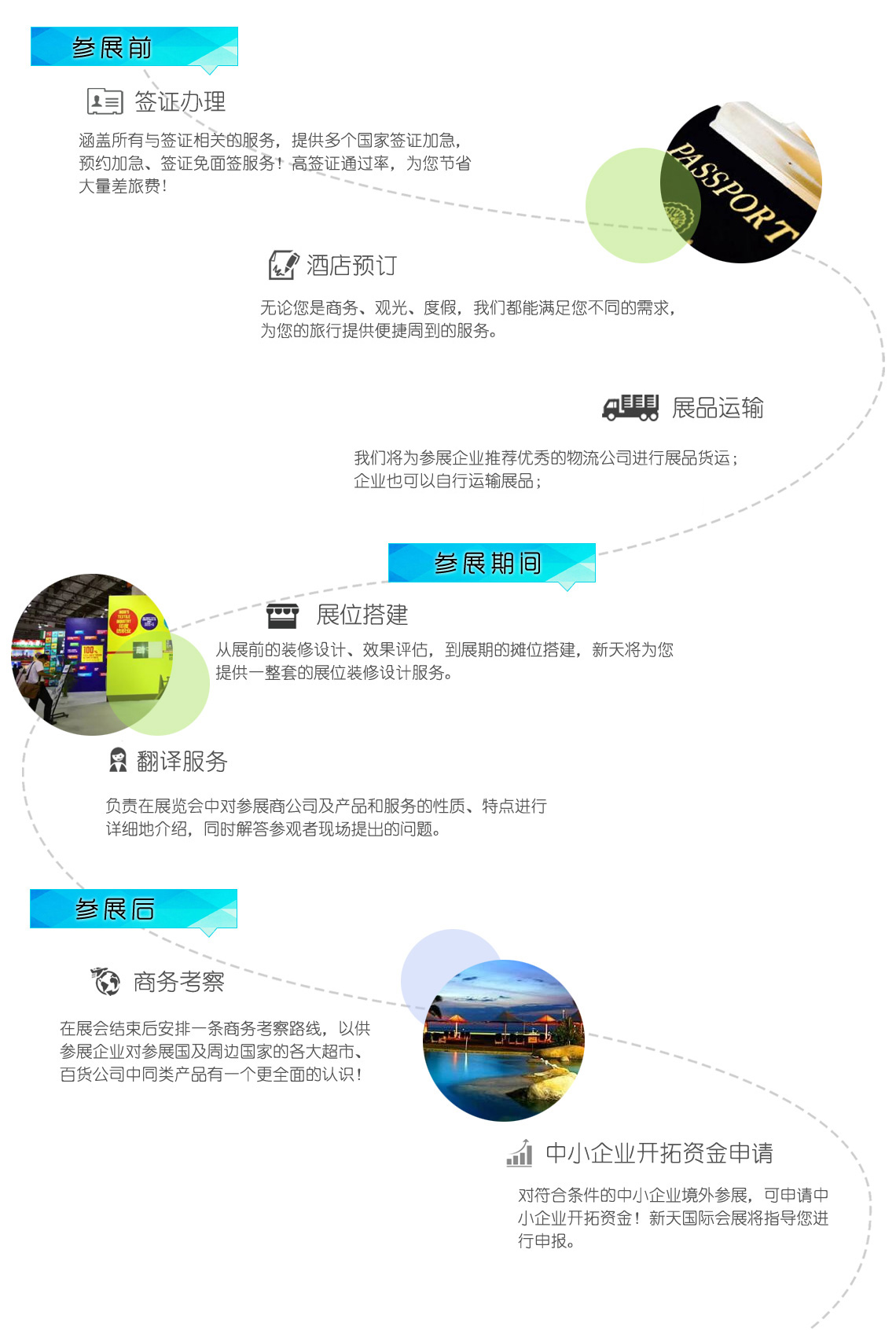 出国轻松参展! 参展服务项目 👁 906人 出国参展 展商3个阶段7个步骤, 展会牛帮你一站式搞定! 轻松参展! 签证办理 酒店预订 展品运输 展位搭建 翻译服务 商务考察 中小企业开拓资金申请 国外展会咨询